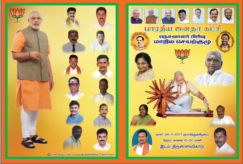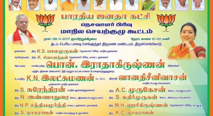 MADURAI:   The State Executive Committee meeting of Tamil Nadu BJP Weavers Cell will be held at Tiruchengode on November 26th 2017 (Sunday) from 10 a.m.