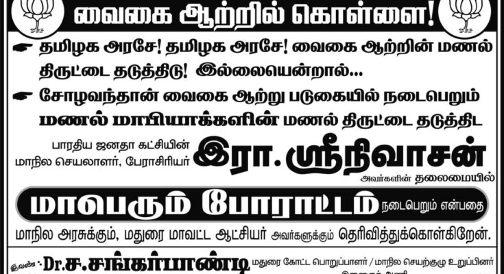 “Local people in Sholavandhan area came to us to help stopping ILLEGAL SAND QUARRYING mining and asked the BJP to intervene. Police denied us permission……..We have information that AIADMK and some DMK functionaries are involved and hence the BJP wants the Madurai police and district authorities to investigate and taken proper action,” said Mr.Sankara Pandi.