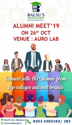 MADURAI: Leading coaching institution for students towards admission to higher education courses – BALSU’S Success Academy in Madurai – is creating a new bond between its alumni and present batches by organizing Alumni Meet’19 on October 26th 2019 (Saturday) at Auro Lab in Veerapanjan, Madurai, from 8.30 a.m to 12.30 p.m.