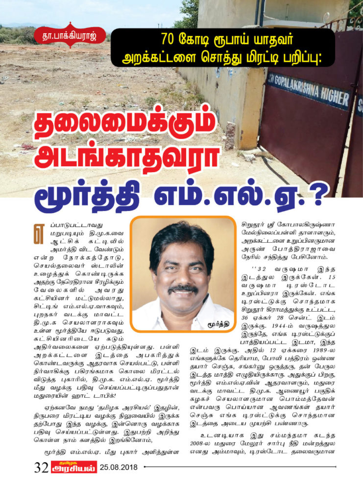 He cited the DMK MLA P.Moorthy’s recent example of how he threatened a person connected to an educational institution in Madurai in a land issue and the subsequent intervention / direction of the Madurai Bench of Madras High Court to the Madurai police to investigate into the issue. (The complaint is by petitioner E.M.G.Arun Pothiraj, son of E.M.G.Soundararajan, Correspondent, Sri Gopalakrishna Hr.Sec.School, Siruthoor, Madurai-16).