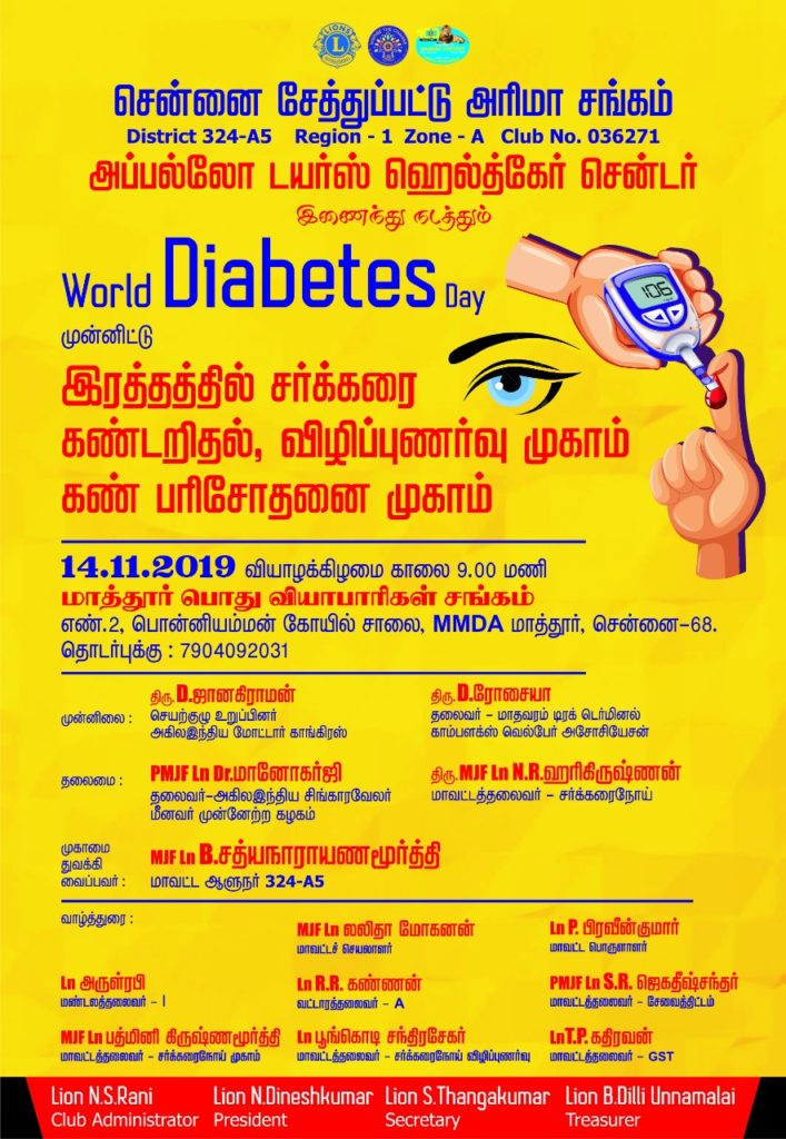 CHENNAI: In connection with World Diabetes Day on November 14th, the Lions Club of Madras Chetpet is conducting a diabetes screening camp on that day at MMDA Mathur, Madhavaram- in Chennai, in association with Apollo Tyres Health Centre.