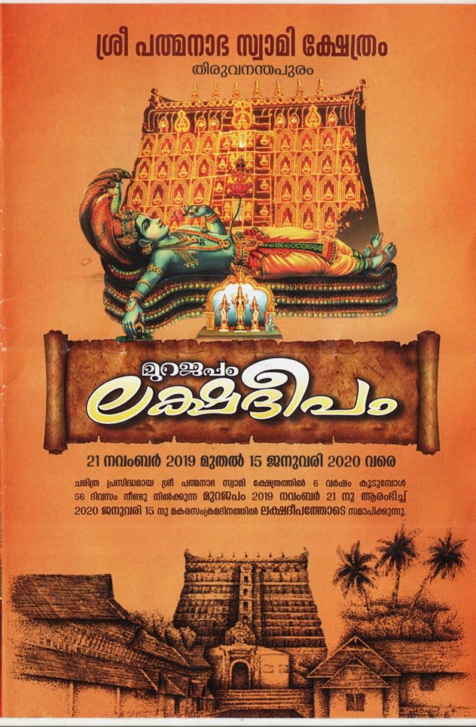Thiruvananthapuram: The 56-day long Lakshadeepam festival of famous Sree Padmanabha Swamy Temple in Thiruvananthapuram in Kerala began on November 21st 2019 early morning with ritual ‘Mura Japam’. The festival of lighting of one lakh lamps is held once in six years and hence it draws a huge congregation of devotees from various places to participate in the religious, cultural, music, dance, bhajans and various other devotional programmes during this period.