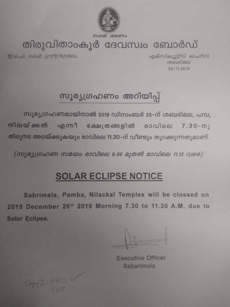 According to a press release from Sabarimala Executive Officer, the temples at Sabarimala, Pamba and Nilackal will be closed during that timings.
