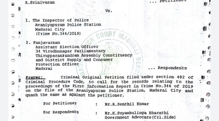 Mr.S.Venkatesan, Madurai MP representing CPI(M), had lodged a complaint alleging that the BJP leader made a defamatory speech during the election campaign time early this year. The case was however quashed by the High Court Madurai Bench on 31st October 2019.