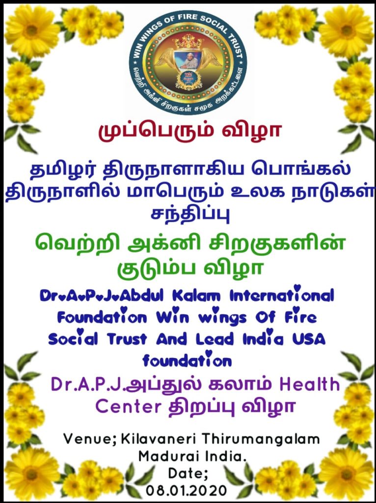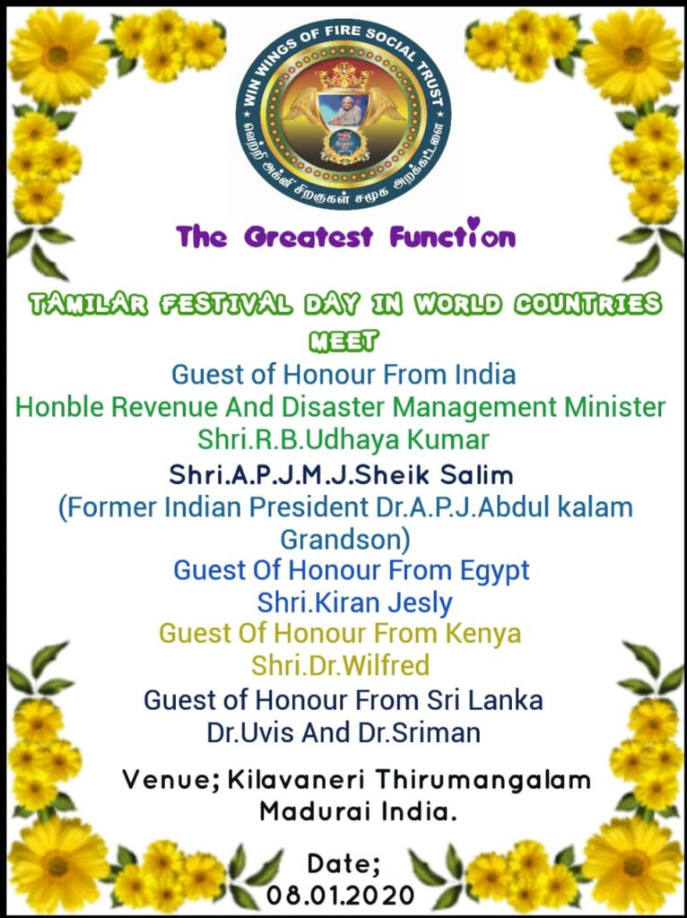 This initiative of conducing Tamilar festival was taken by ‘Win Wings of Fire Social Trust’ which has invited guests from various countries including Kenya, Egypt, Sri Lanka, Malaysia and Singapore. And from India, people are coming from different States to take part in the pre-Pongal ‘Tamizhar Thirunaal’ celebrations near Thirumangalam on 8th January.