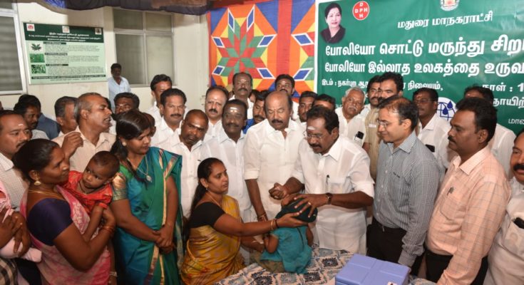 Cooperation Minister Mr.Sellur K.Raju inaugurated the pulse polio immunisation drive at a camp in Madurai Corporation Urban Primary Health Centre in Sellur here today morning. Madurai North MLA Mr.V.V.Rajan Chellappa, District Collector Dr.T.G.Vinay, Corporation Commissioner Mr.Visakan and others were present.