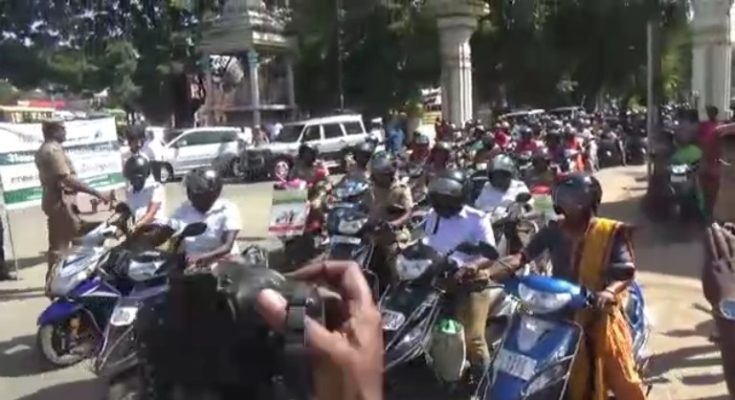 MADURAI: More than 1,000 women police and members of women Self Help Groups today took a two-wheeler drive in Madurai city to create public awareness about road safety, helmet wearing and prevention of accidents by avoiding speed driving.