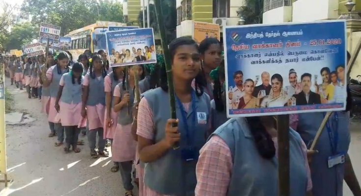 Students of Kakkai Padiniyar Girls Higher Secondary School at Tallakulam here participated in the rally. Teachers and other staff also took part. The objective of National Voters Day is to encourage more young voters to take part in the political process by casting their vote during elections.