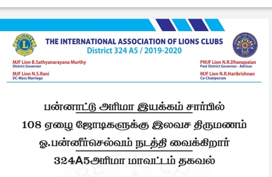 For the 12th February free marriage ceremony to be performed in the presence of Deputy CM Mr.OPS, the Lions Clubs International District 324-A5 will provide several things freely to help the poor families belonging to various families. They include marriage ‘thali’, vessels, marriage clothes, provisions for one month and many more.