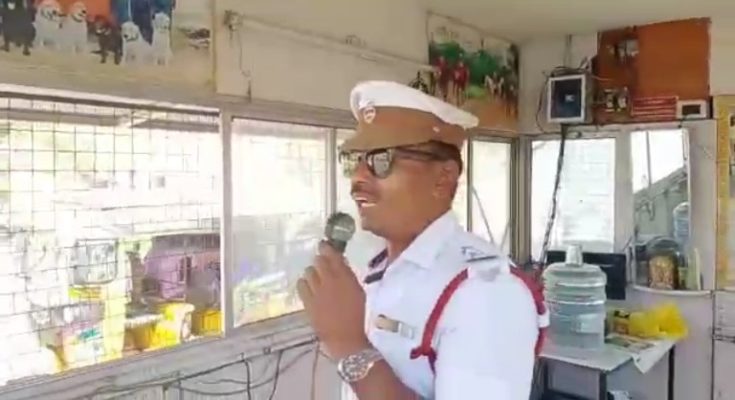 At the ‘very busy ‘Aavin’ signal near Anna Bus stand in Madurai city, a traffic police inspector Mr.Palanisamy of Madhichiyam police station has been relentlessly talking and guiding the people through his mike about the need to control speed and follow the road rules and traffic regulations.