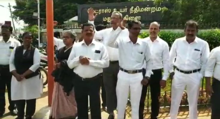 MADURAI: Condemning the riots and violence that took place in the last few days, advocates and senior lawyers have staged a demonstration before the High Court Bench in Madurai today- 28th February 2020- urging the Central government to take action against the rioters.