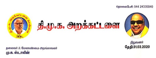 Party president Mr.M.K.Stalin has said that the DMK Foundation will do everything possible to help the affected people. A letter offering the ‘Kalaignar Arangam’ space to be used for quarantining was handed over to Chennai Corporation Commissioner Mr.G.Prakash here today- 31st March 2020- by Chennai South DMK Secretary Mr.M.Subramanian and Chennai East DMK Secretary Mr.P.K.Sekar Babu.