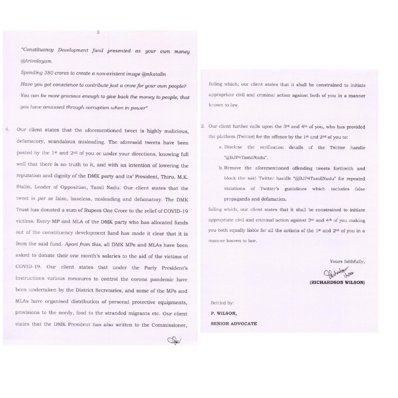 Following a complaint by the party and DMK Organizing Secretary Mr.R.S.Bharati, the legal notice was sent by law firm P.Wilson Associates- advocate Rciahrdson Wilson- P.Wilson on 1st April 2020. The legal notice cited the names of BJP National President Mr.J.P.Nadda, Tamil Nadu BJP State president Mr.L.Murugan and Twitter.