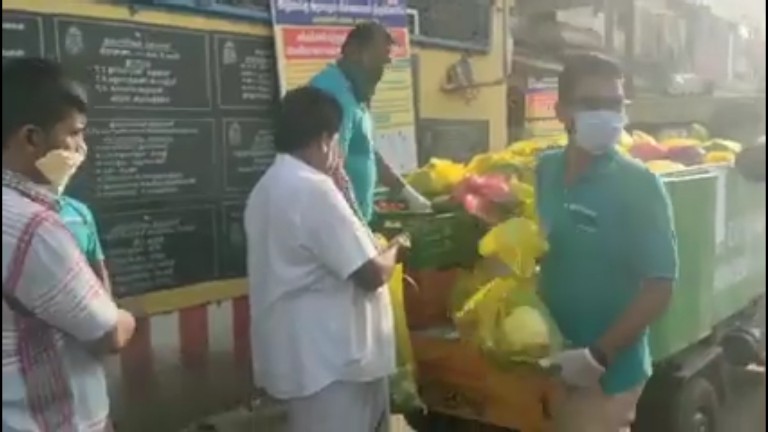 Madurai Corporation has been selling vegetable and fruit bags through mobile vans since there are restrictions for crowd gathering in markets due to total lock down- Section 144.