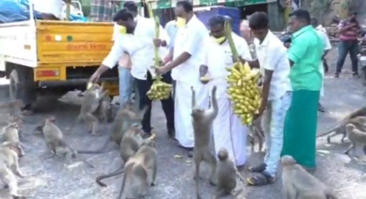 At the famous Alagarkoil Temple near Madurai, devotees are coming forward to feed the monkeys at a time when Section 144 restrictions – total lockdown- have put lots of restrictions on movement.