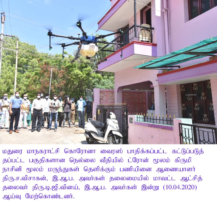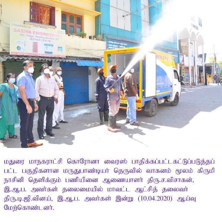 On 10th April 2020, Madurai District Collector Dr.T.G.Vinay and Corporation Commissioner Mr.S.Visakan carried out inspection at various places in the city where severe restrictions of public movement and no entry through barricades is being enforced here to prevent virus spread.