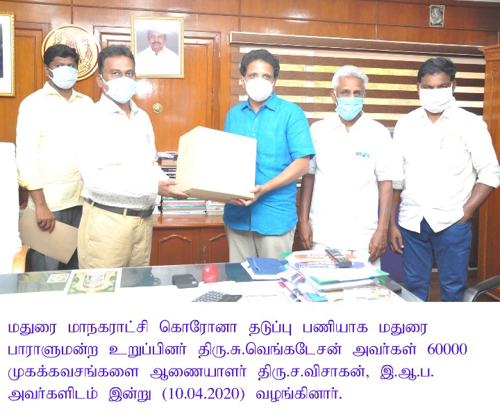 MADURAI: Member of Parliament of Madurai Lok Sabha constituency Mr.Su.Venkatesan had today provided 60,000 facemasks to Madurai Corporation which will be given to Corporation workers- sanitary workers as Coronavirus preventive measure.
