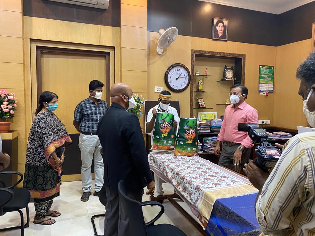 The 100 packed bags containing these essential items were handed over to Madurai District Collector Dr.T.G.Vinay here by a team led by American College Principal Dr.M.Thavamani Christober on 11th April 2020.
