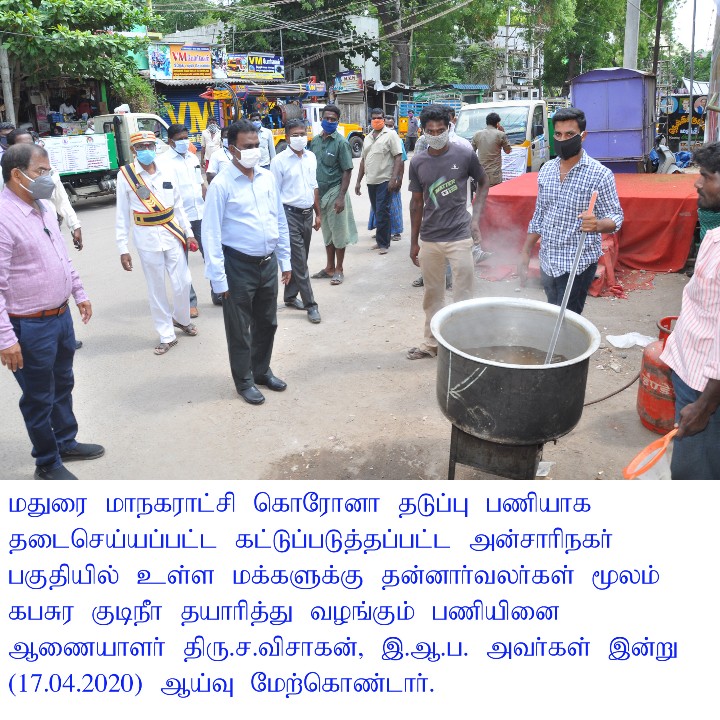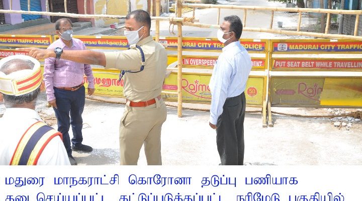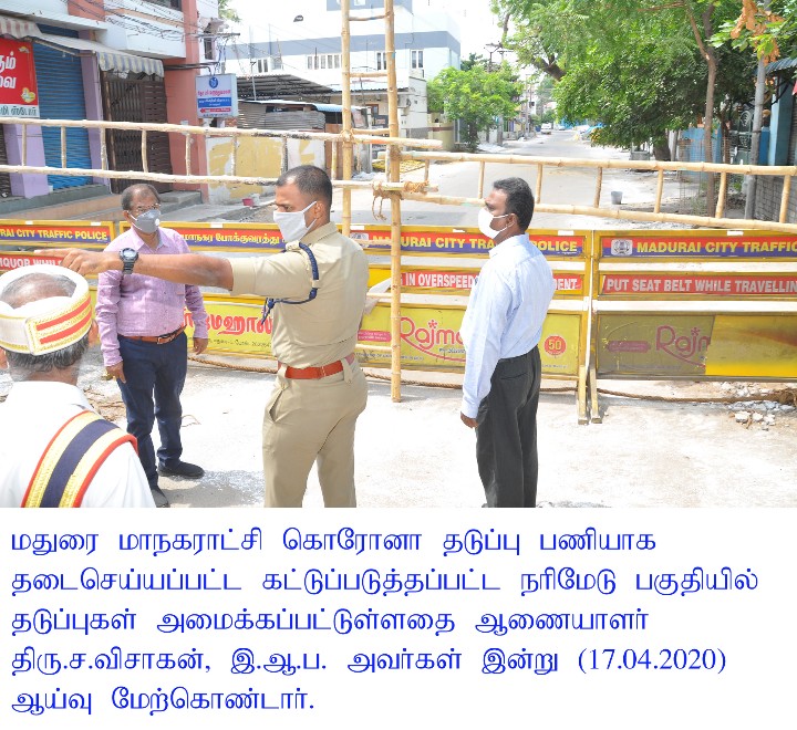 On 17th April 2020, he along with senior officials carried out inspection in all the seven restricted areas where people were asked to confine to their homes. The seven places are:1. Mahaboobpalayam Ansari Nagar 2. Anaiyur SVP Nagar 3. Mathichiyam 4. Narimedu 5.Kuppupillai Thoppu Street near North Masi Street Crime Branch 6.Gomathipuram Yagappa Nagar 7.ThapalThanthi Nagar.