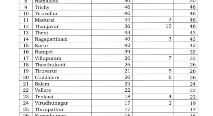 Chennai had fresh cases of 50, Thanajvur had 10 cases and Madurai district two new cases in the last 24 hours, according to media bulletin released by the Health and Family Welfare Department of Government of Tamil Nadu at 6 pm on 19th April 2020.