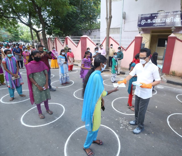 Mr.Stalin handed over essnetial items such as vegetables to affected persons from Egmore, He had reached out to 200 ‘Salavai’ (washermen) workers in Thiru.Vi.Ka. Nagar. At Kolathur, the DMK president helped people in a big way by distirbuting assistance relief materials to 6,000 perople. For Rajamangalam police station personnel, he gave sanitisers and protective items. Also, he helped 200 sanitary workers at Villivakkam bus stand by giving essential food items such as groceries.