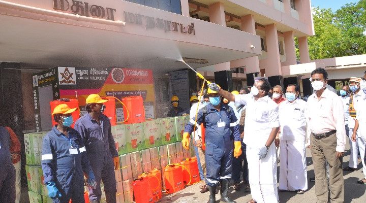 MADURAI: The disinfectants spraying capacity of Madurai Corporation got a further boost today with the addition of 100 battery operated hand spraying machines today- 20th April 2020. Also, two powerful minijet spraying units have been acquired for carrying Corona prevention- disinfection activities in wards falling under Madurai West Assembly constituency.