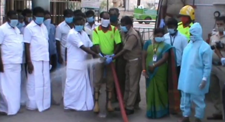 Alagarkoil Temple sprayed with Corona disinfectants (Video)