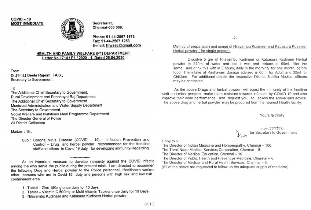 Dr.Mrs.Beela Rajesh, Tamil Nadu Health Secretary, had written a letter on 25th April 2020 and sent it to all important departments. The recommendation of ‘Kabasura Kudineer’ and ‘Nilavembu Kudineer’ herbal concoction herbal powder is particularly important to police personnel, healthcare workers and other persons on COVID-19 duty and also to those persons with high risk / low risk in containment areas in the State.