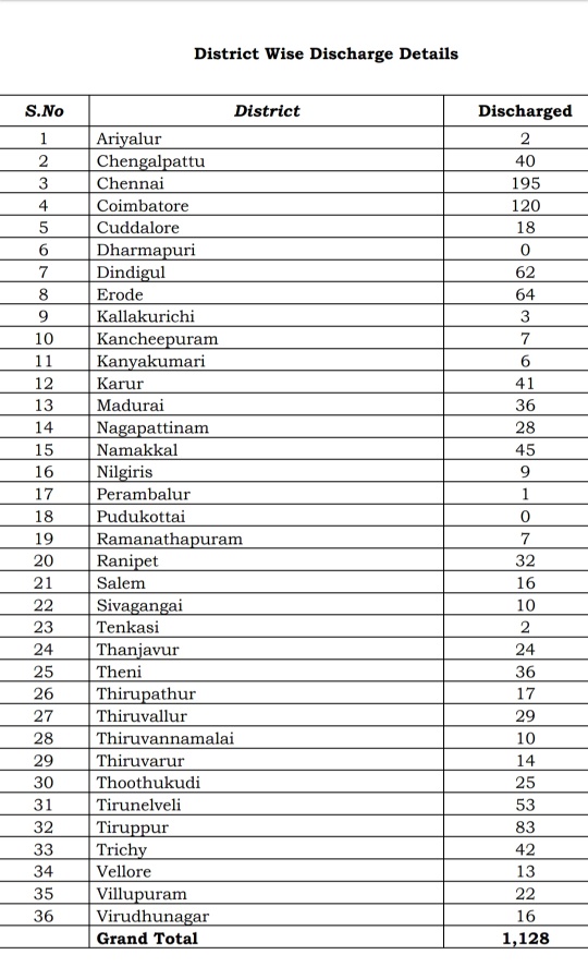 MADURAI: The total number of Corona patients discharged from hospitals in Tamil Nadu after treatment is 1,128 as on 28th April 2020. Today, 27 patients got discharged in the State in various districts.