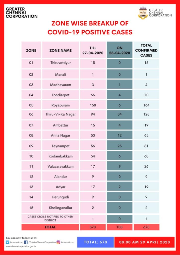 There are 15 Zones in Greater Chennai Corporation having totally 673 COVID positive confirmed cases on 28th April 2020.
