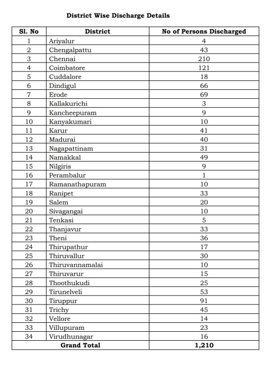 MADURAI: Totally 1,210 Corona Positive patients  have been discharged following treatment till today in Tamil Nadu. There are 922 active case sunder treatment as on today – 29th April 2020, according to media bulletin released by the Health and Family Welfare Department-Directorate of Public Health, Government of Tamil Nadu, today evening- 29th April 2020.