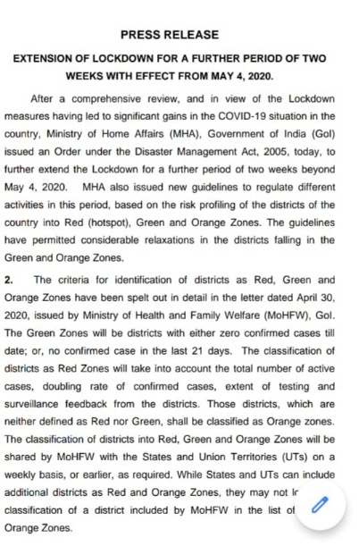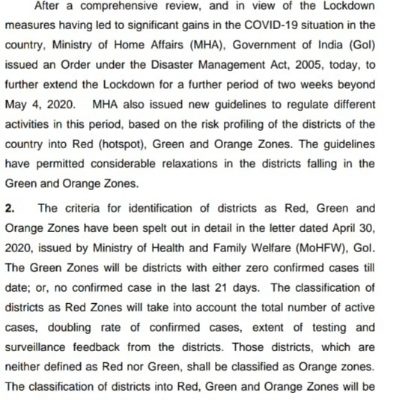 MADURAI: The Union Ministry of Home Affairs of Government of India has issued an order today extending the Corona lockdown for a further period of two weeks beyond 4th May 2020. New guidelines were issued to regulate different activities in districts based on risk profiling in Red, Orange and Green zones.