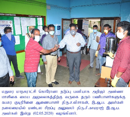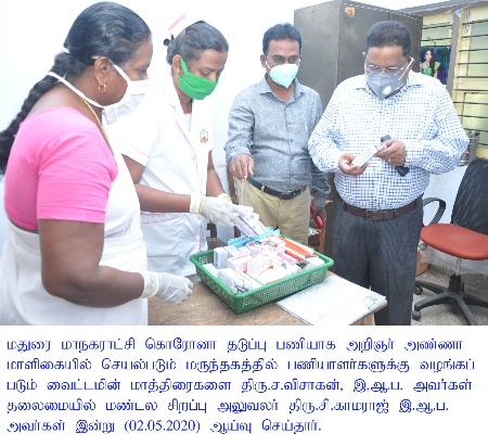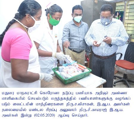 On 2nd May 2020, Mr.C.Kamaraj (IAS), Zonal level special officer to coordinate corona control and relief activities in Madurai district, had visited the Madurai Corporation building ‘Anna Maaligai’ where he inspected the control room and also enquired about spraying of disinfectants in different parts of the city, distribution of vitamin tablets to sanitary workers, special measures being taken in corona containment zones and social distancing.