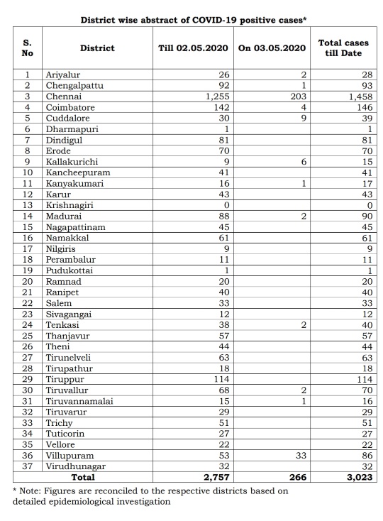 As on 3rd May 2020, the number of COVID Positive cases in the State is 3,023.