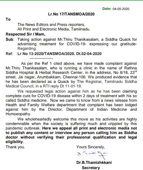 “The associations of both government and private doctors of all Indian systems medicine met to discuss this fake doctor pandemic. From the numbers that are registered with council and the number of people out there, we could make out that the number of quacks is not less than 10,000 in our State alone,” Dr.B.Thamizhkkani, State Secretary, Tamil Nadu Siddha Medical Officers’ Association, has said on 8th May 2020.