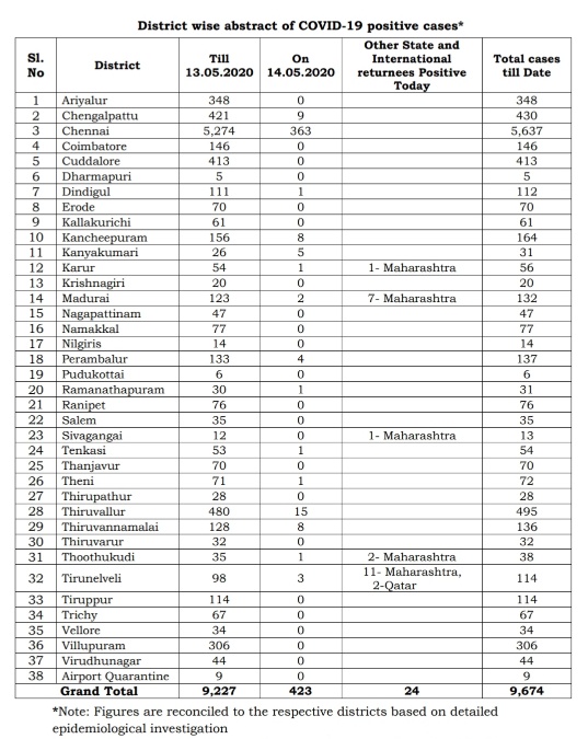 MADURAI: The total number of Corona Positive cases in Tamil Nadu today -as on 14th May 2020 – is 9,674 cases. Today, the total cases reported from various districts in the State are 423 of which 363 were from Chennai.