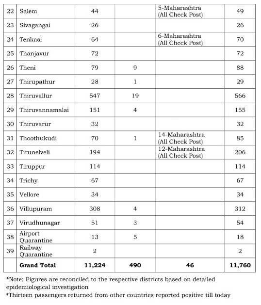 Health Minister Dr.C.Vijayabaskar had released a media bulletin at 6 pm today giving districts wise abstract of COVID-19 positive cases in Tamil Nadu and the overall statistics of cases, testing and discharge of infected persons from various hospitals in the State.