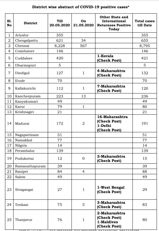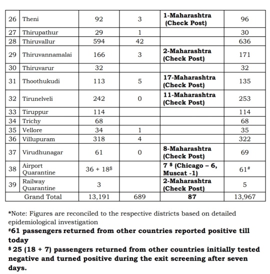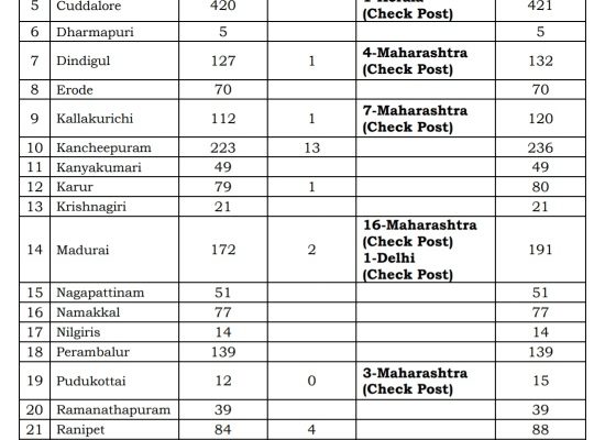 MADURAI: The total number of Corona positive confirmed cases in Tamil Nadu as on today is 13,967 cases (21st May 2020). There were 689 positive cases in the State today alone and plus another 87 cases of those from other States / international returnees, according to the media bulletin by the Health and Family Welfare Department, Government of Tamil Nadu, which was released today evening- 21st May 2020.