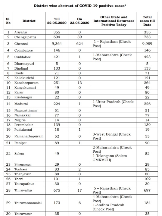 Today, the State had 710 positive cases and another 49 cases of those coming from other States / international returnees. Chennai had 624 positive cases today alone, the 23rd May 2020 media bulletin said. Madurai district had one positive case plus another one case of Uttar Pradesh returnee.