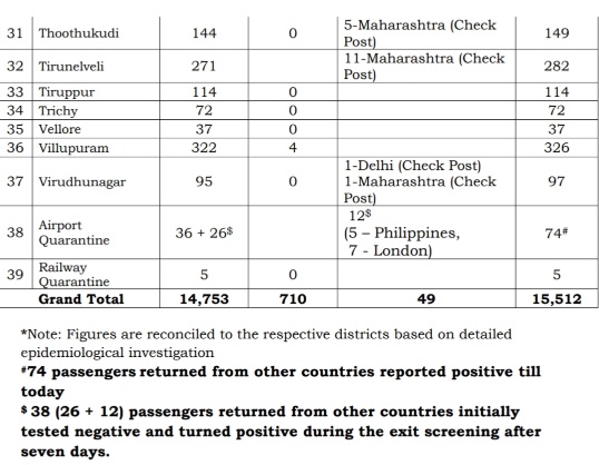 Media bulletin released by the Directorate of Public Health and Preventive Medicine- Health and Family Welfare Department of Government of Tamil Nadu – has informed that the total number of COVID-19 confirmed cases in the State is 15,512 till date.