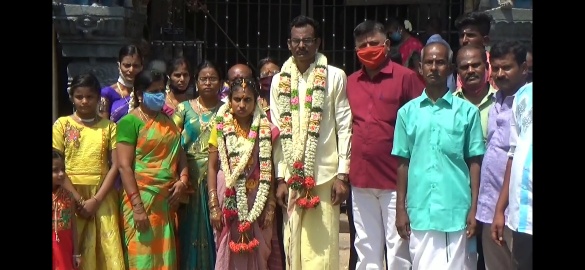 Since the marriage ‘Muhurtham’ season is getting over, 38 simple marriages took place outside the famous Tirupparankundram Murgan temple in Madurai today- 24th May 2020.