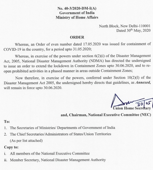 MADURAI: The Union Ministry of Home Affairs of Government of India has today extended the Corona lockdown in containment zones across the country till 30th June 2020.