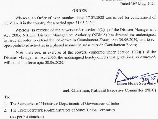 MADURAI: The Union Ministry of Home Affairs of Government of India has today extended the Corona lockdown in containment zones across the country till 30th June 2020.