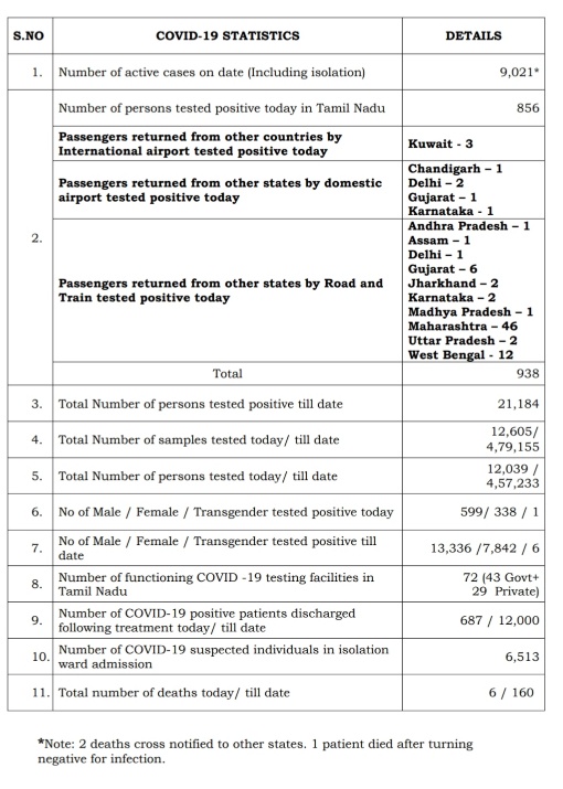 MADURAI: The Health and Family Welfare Department of Government of Tamil Nadu has released a media bulletin today giving complete statistics of Corona positive COVID-19 situation in Tamil Nadu as on 30th May 2020. There were 938 confirmed positive cases in the State in a single day today – 30th May 2020.