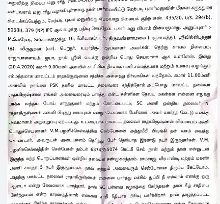 It has come to light that party office-bearer Mr.Suresh from Srivilliputur and others who went along with him were threatened by him in the party office. When they went for a discussion meeting to Rajapalayam in the month of, it was learnt that they were abused with filthy language and hence the police complaint. Sources in the BJP said today (on 31st May 2020) that party leaders tried their best to stop police FIR but ultimately FIR was registered against the BJP district president Mr.S.Radhakrishnan after one month of the incident. WHO IS BEHIND THIS IS BEING PROBED whether caste equations are influencing.