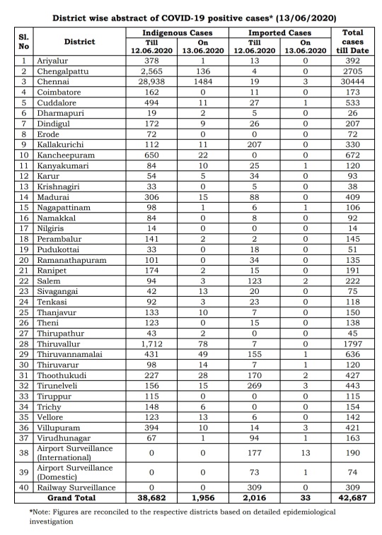 MADURAI: Corona positive confirmed cases in Tamil Nadu continued to rise on 13th June 2020 also. There were 1,956 COVID-19 new cases in the State and another 33 imported cases. The total number of Corona cases in Tamil Nadu till date is 42,687 cases, according to media bulletin released by the Health and Family Welfare Department of Government of Tamil Nadu today evening- 13th June 2020.