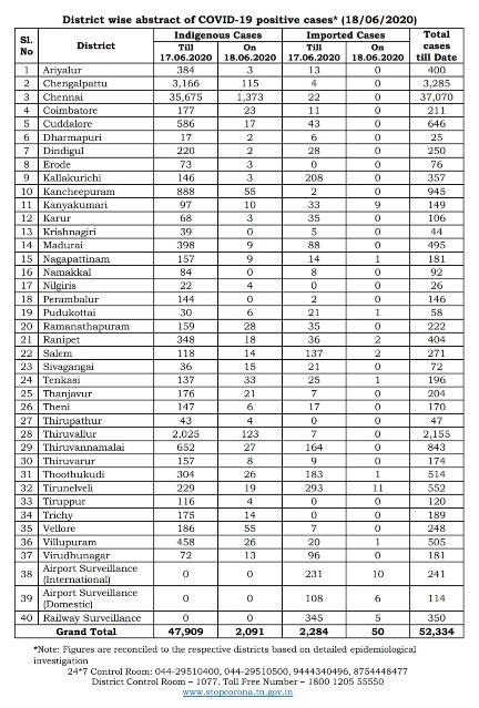 MADURAI: Corona positive confirmed cases in Tamil Nadu continued to increase today also as 2,091 new cases were reported from various districts in the State on 18th June 2020. The Health and Family Welfare Department of Government of Tamil Nadu had released district wise abstract of COVID-19 positive cases today evening- 18th June 2020. Total number of Corona cases till date is 52,334.