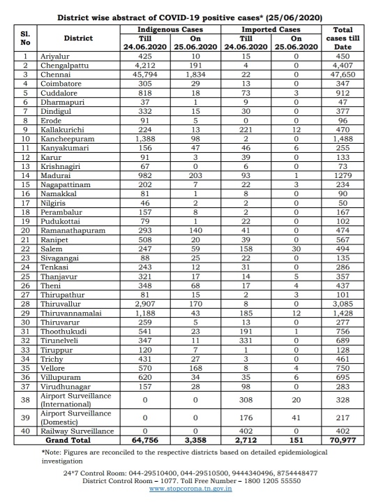 MADURAI: For the first time, Tamil Nadu had reported more than 3,000 COVID positive cases in a single day today- on 25th June 2020. There were 3,358 new indigenous Corona positive cases confirmed from various districts in Tamil Nadu and another 151 imported cases, according to media bulletin released by the Health and Family Welfare Department of Government of Tamil Nadu, today evening- 25th June 2020, giving district-wise abstract of COVID-19 positive cases in the State. The total number of Corona cases is 70,977 till date.