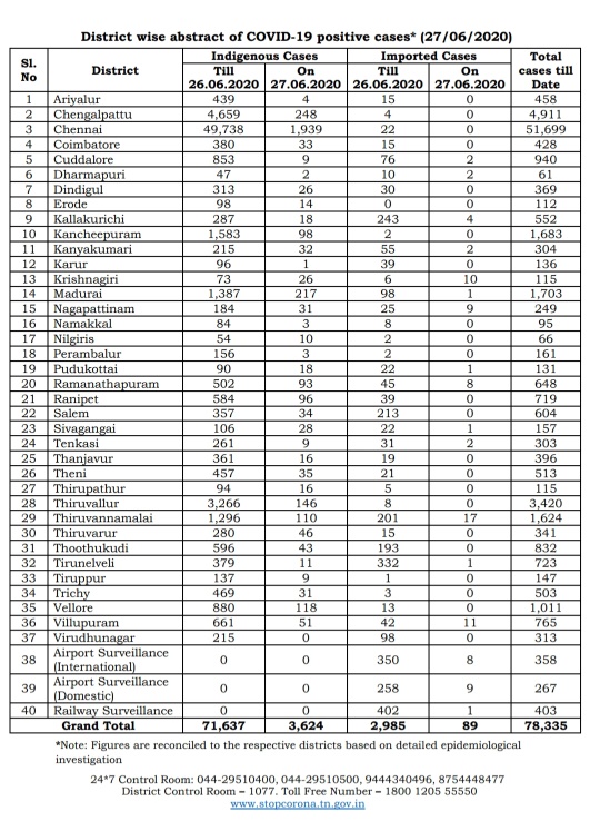MADURAI: The spike of Corona positive cases in Tamil Nadu continued on 27th June 2020 also as the State had 3,624 new indigenous cases reported from various districts today. Also, there were additional 89 imported cases today. The total number of COVID-19 cases till date in Tamil Nadu is 78,335, according to media bulletin released by the Health and Family Welfare Department today evening- 27th June 2020.
