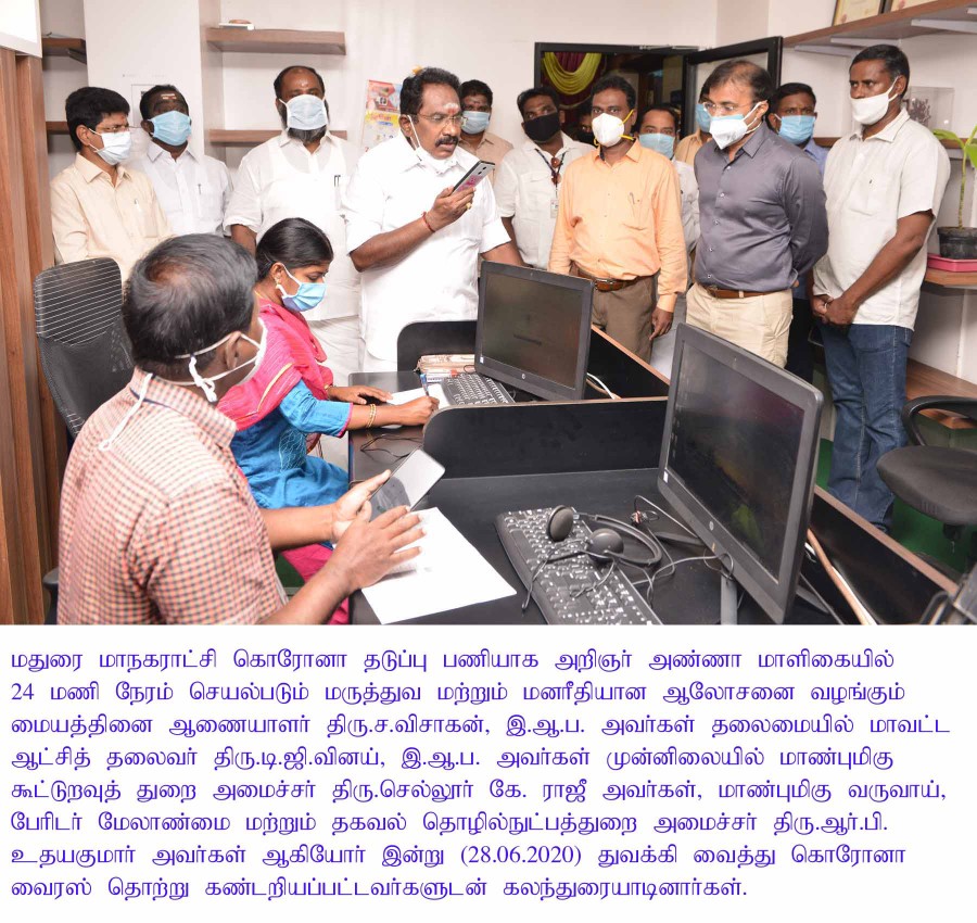 Tamil Nadu Ministers Mr.Sellur K.Raju and Mr.R.B.Udayakumar have opened the counselling centre in Madurai on 28th June 2020 in the presence of Madurai District Collector Dr.T.G.Vinay, Madurai Corporation Commissioner Mr.S.Visakan and public health officials.